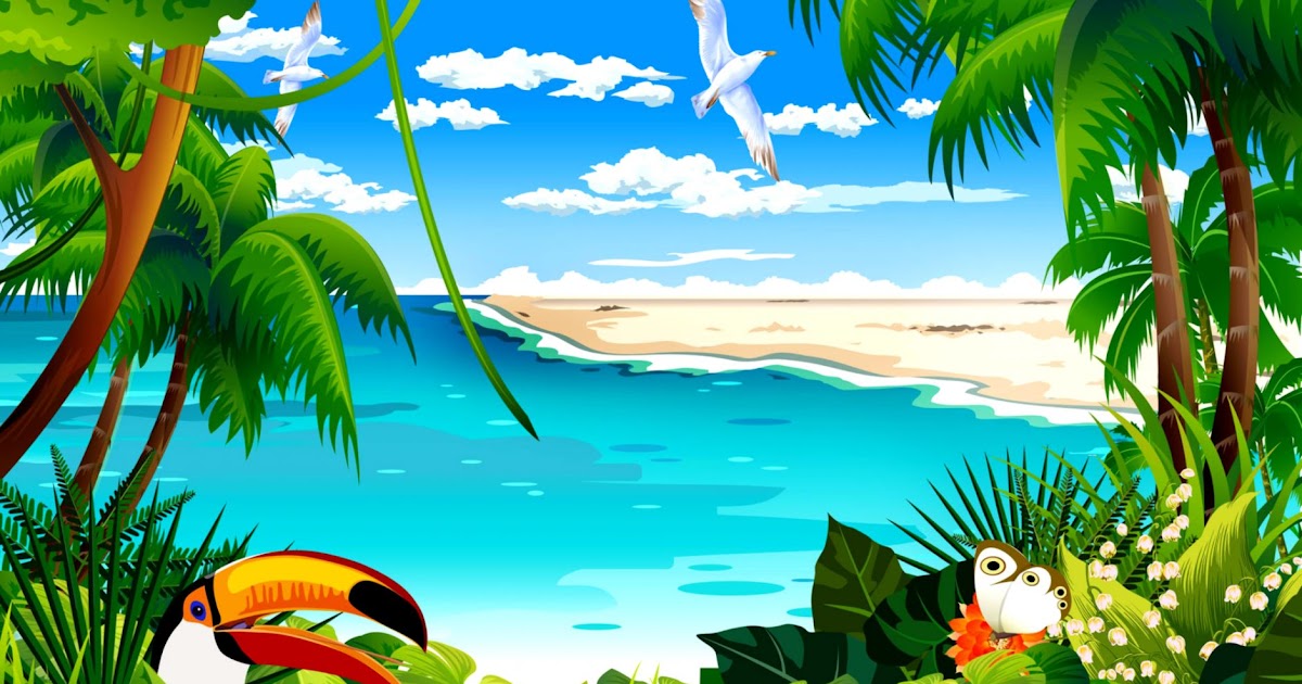 cartoon beach summer wallpapers ocean vector mac desktop palm water wallcoo tropical trees screensavers attack backgrounds wallpapersafari background absorption illustrations