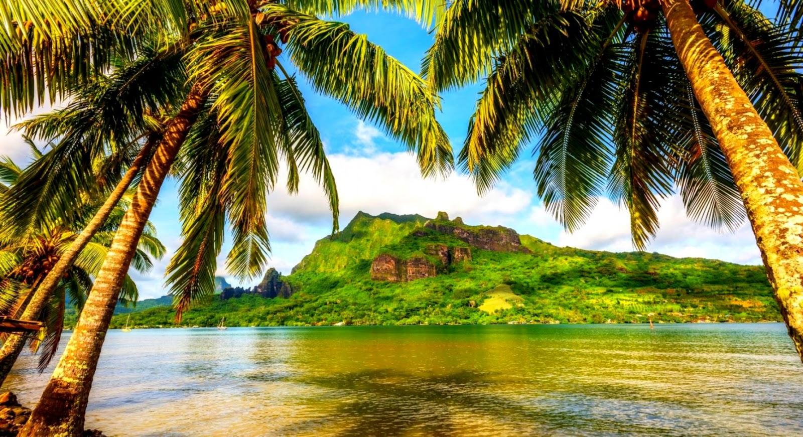 tropical palm island trees landscape mountain bora sea sand nature clouds vacations wallpapers backgrounds desktop resolution